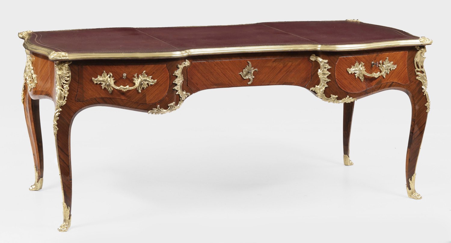 Palisander und Satinholz, furniert sowie Applikationen aus vergoldeter Bronze. Bombierter, passig geschweifter Zargenkasten auf stark geschwungenen Beinen. In der gegliederten Front drei Schubladen unterschiedlicher Größe. Allseitig breit berahmte, gespiegelt angeordnete Furnierfelder sowie reiche Rocailleapplikationen. Profilgerahmte Deckplatte aus rotviolettem, goldgeprägtem Leder. Schlagstempel-Sign. J.ZWIENER sowie Bronzen rücks. bez. ZN. H. 74 cm. 184 cm x 90 cm.