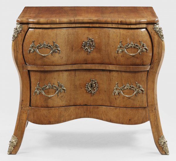 Kleine Barock-Kommode Nussbaum, furniert. Dreiseitig bombierter Korpus, flankiert von schmalen, schräggestellten Ecklisenen mit applizierten Fratzenmotiven. In der gegliederten Front zwei Schubladen. Dem Korpus entsprechende Deckplatte. H. 75,5 cm. 85 cm x 52 cm.