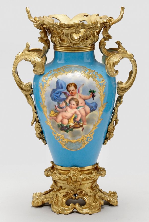 Napoleon III Prunkvase mit Putten- und Blumendekor mit vergoldeter, stark reliefplastischer Bronzemontierung aus aufsteigendem Blatt-, Rocaille- und Blütenwerk. Über hohem, durchbrochen gearbeitetem Sockel ansetzender, balusterförmiger Porzellankorpus mit weit ausladender Mündung. Beidseitig der Wandung, in "Bleu celeste"-Fond ausgesparte goldornamentierte Reserve mit Darstellung von Putten mit Weintrauben und Weinkanne, über Wolken schwebend bzw. farbenprächtiges Blumenarrangement in polychromer Malerei. H. 41 cm.