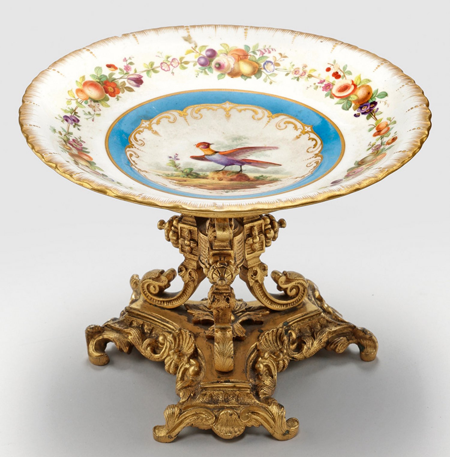 Französische Tazza mit vergoldetem, reliefplastischem Bronzeschaft. Über dreipassig geschweiftem, rankenumzogenem Sockel volutenförmiger Schaft mit eingelassenem Porzellanteller. Im Spiegel und auf der Fahne, zwischen "Bleu celeste"-Fond, farbiger Dekor aus Früchtegebinden und Vogelmotiv in polychromer Malerei. Golddekor. Rücks. altes Klebeetikett mit Inv.-Nr. 113. Minim. rest.; H. 13,5 cm.