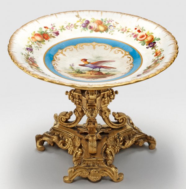 A French gilt-bronze and porcelain tazza with flower and bird decor. On the reverse old label with no. 113. Minor restored.