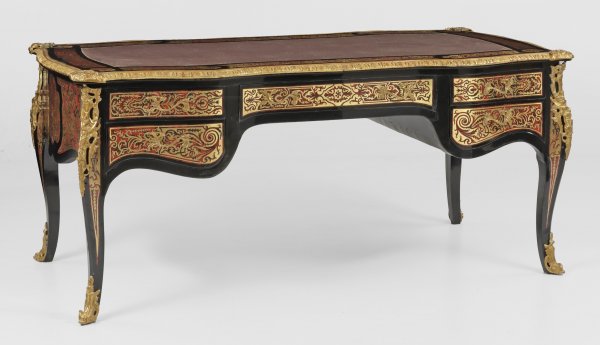 Repräsentatives Bureau plat im Boulle-Stil Holz, schwarz lackiert sowie flächendeckende Marketeriefelder aus Messing und rot hinterlegtem Lack in sog. Boulle-Technik. Allseitig bombierter Korpus, flankiert von schmalen Ecklisenen, in geschwungene Beine übergehend. In der gegliederten Front fünf Schubladen unterschiedlicher Größe. Korrespondierende, gering überstehende, profilgerahmte Deckplatte mit rotbrauner Arbeitsfläche. H. 81 cm. 184 cm x 98 cm.