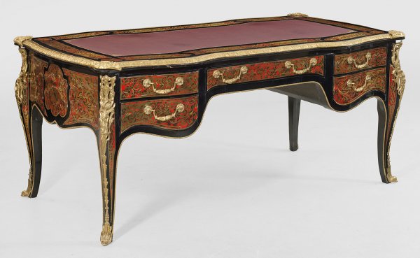 Großes Bureau plat im Boulle-Stil Holz, schwarz lackiert sowie flächendeckende Marketerie aus ornamentiertem Messing und rot hinterlegtem Lack in sog. Boulle-Technik. Allseitig leicht bombierter, passig geschweifter Korpus, flankiert von ausgezogenen Ecklisenen, in geschwungene Beine übergehend. Entsprechende, profilgerahmte Deckplatte. Allseitig gerahmte Marketeriereserven aus üppigen Volutenmotiven sowie Applikationen aus vergoldeter Bronze. Besch.; H. 83 cm. 187 cm x 96 cm.