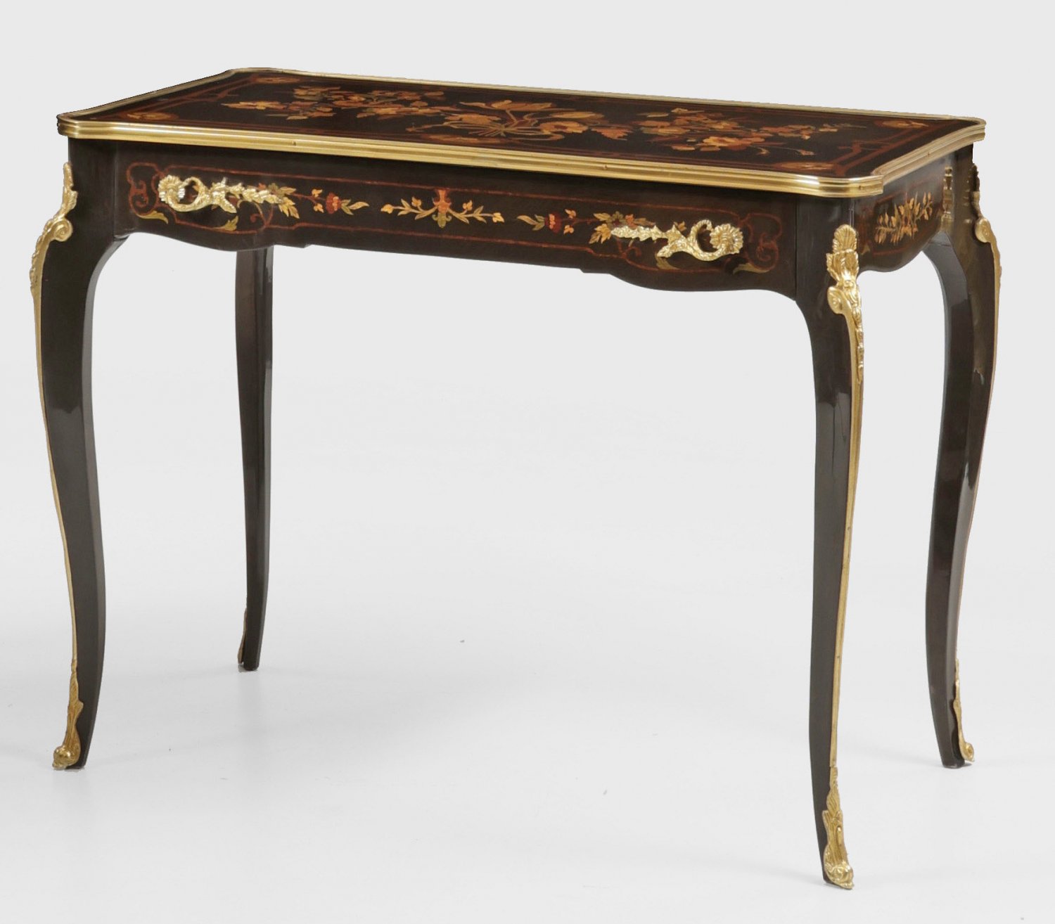 Salontisch im Louis XV-Stil Ebonisiertes Holz, furniert sowie Einlagen aus unterschiedlichen, gefärbten Edelhölzern. Passig geschweifter, einschübiger Zargenkasten auf hohen, geschwungenen Beinen. Korrespondierende, profilgerahmte Deckplatte. Allseitig reiche Dekorationen aus intarsierten Blütenmotiven, von Bandeinlagen begrenzt. H. 78 cm. 100 cm x 57 cm.