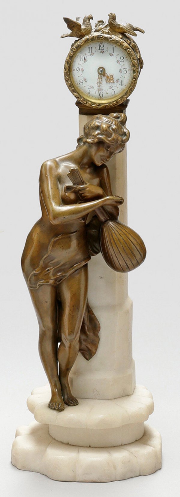 Belle Epoque-Uhr Bronze, patiniert und Alabaster. Über naturalistisch gestaltetem Sockel vollplastische Darstellung einer verträumten Lautenspielerin an konisch ansteigenden Schaft gelehnt. Rundes Uhrengehäuse mit Bekrönung in Form eines Taubenpaares. Werk mit Schlüsselaufzug und Echappement. Rep.-bed.; H. 46 cm.