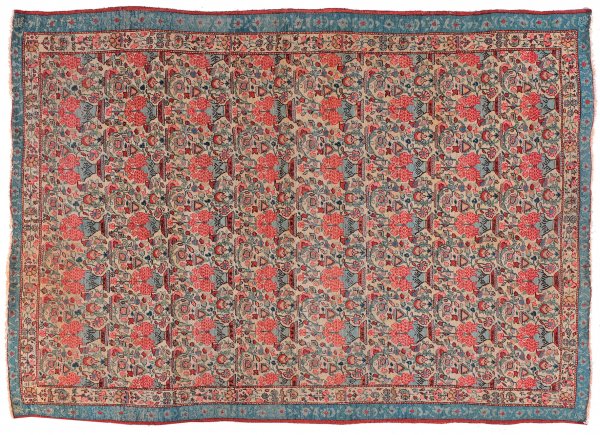 Ghom-Brücke Persien. Mitte 20. Jh. Wolle auf Baumwolle. Auf cremefarbenem Grund flächendeckendes, sog. Silleh-Sultan-Muster aus dicht angeordneten Vasenmotiven im Rapport. Umlaufend schmale Bordüren in Beige und Hellblau. 180 cm x 130 cm.