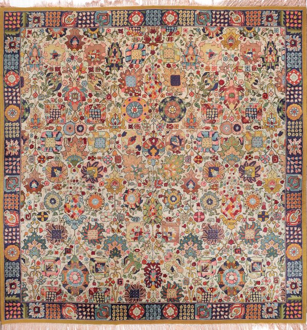Großer alter Salon-Teppich Wohl Tefzet-Teppichmanufaktur. 1. Hälfte 20. Jh.; Wolle auf Baumwolle. Auf cremefarbenem Fond flächendeckende Musterung nach dem Vorbild des sog. Schah Abbas-Musters in unterschiedlichen Blau-, Gelb- und Rosétönen. Umlaufend blaugrundige Bordüre. 344 cm x 322 cm.