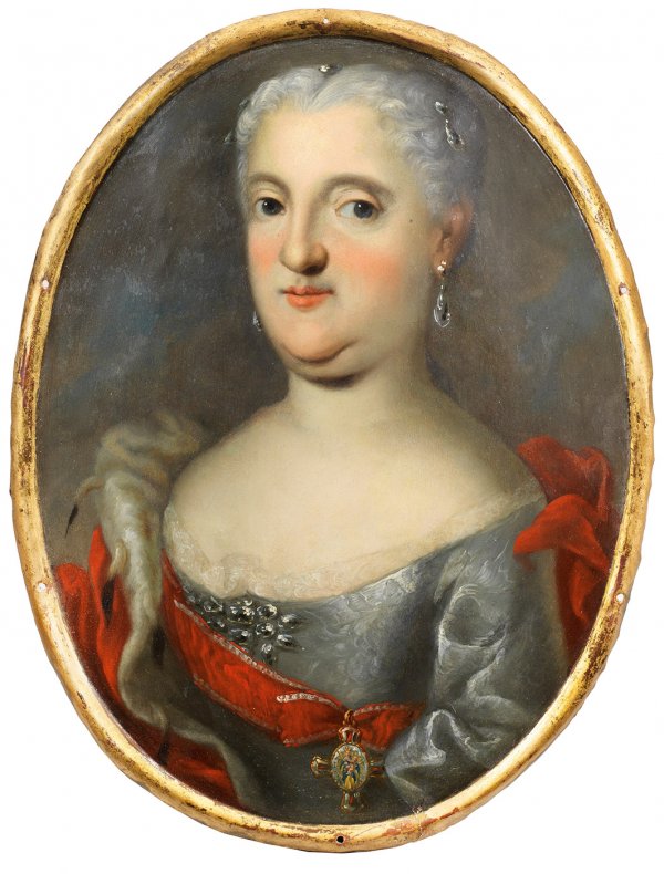 Repräsentatives, wohl 1745/46 entstandenes, ovales Rokoko-Bildnis der Äbtissin in silbergrauem Kleid und Hermelinmantel, an der Brust der 1729 durch die Äbtissin Johanna Charlotte von Brandenburg-Schwedt gestiftete Stern des Herforder Damenstiftsordens an einem roten Band. Öl/konvex gewölbte Kupfertafel. 46 cm x 35 cm.