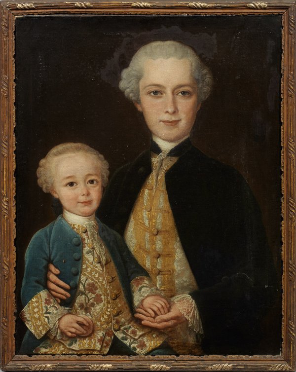 Repräsentatives Bildnis des eleganten Rokoko, das die Porträtierten in höfischer Kleidung mit kostbarer Spitze und Brokat zeigt. Der Porträtmaler Jean Chevalier schuf offenbar mit Vorliebe feinfühlige Familienbildnisse, die eine innige Vertrautheit von Eltern mit ihren Kindern widerspiegeln. Öl/Lwd., doubl.; Rest.; 81 cm x 65 cm. Rahmen.