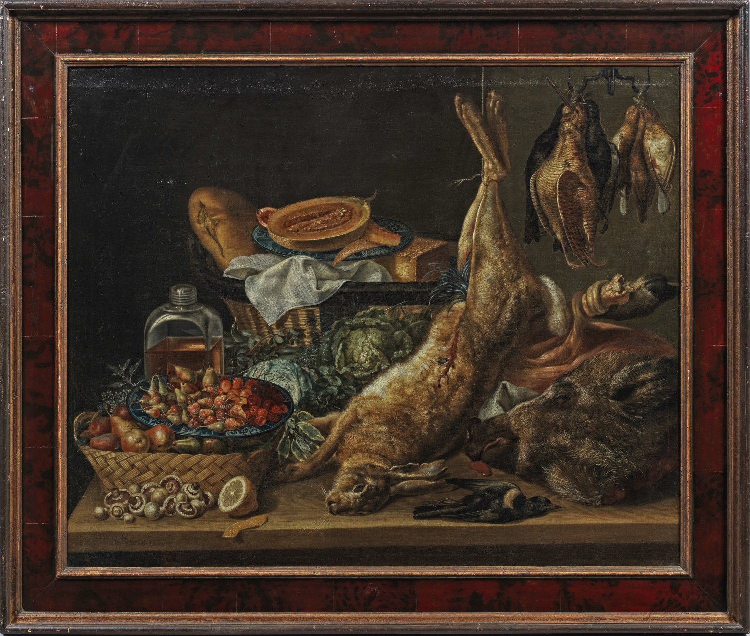Auf einer bildparallel angeordneten, hölzernen Tischplatte arrangierte Harms ein zweigeteiltes Stillleben. Auf der rechten Seite schilderte er unterschiedliches erlegtes Wild: einen großen, diagonal im Zentrum des Bildes hängenden Hasen, an dem sich bereits eine Fliege delektiert; daneben ein liegender Vogel und ein Wildschweinkopf, darüber erlegte, zu Dreierbündeln aufgehängte Wildvögel. Die linke Seite des Gemäldes wird hingegen von Feld- und Gartenfrüchten und daraus hergestellten Produkten dominiert, die Harms in ein Ensemble aus Körben und blau-weißen Fayence- oder Porzellantellern dekorierte: vorne Birnen, Erdbeeren, Kirschen, Champignons und eine Zitrone, dahinter zwei Kohlköpfe, Kräuter, Olivenzweige, eine halb gefüllte Karaffe, abgerundet wird das Stillleben durch einen großen Brotlaib, einen aufgeschnittenen Kürbis und ein Stück Käse. Aufgrund der künstlerischen Qualität und der Opulenz des Stilllebens sowie der Auswahl der Speisen - Wild und Früchte aus einheimischen und südlichen Gefilden - ist der Auftraggeber dieses Gemäldes sicherlich im Adel zu suchen. Diese These wird durch die bewusst platzierte weiße Serviette unterstützt, auf der ein eingesticktes, bekröntes Spiegelmonogramm zu sehen ist. Möglicherweise wurde der Auftrag auch vom Hof des ab 1731 regierenden Herzogs Ludwig Rudolf von Braunschweig-Wolfenbüttel (1671 - 1735) erteilt. Anton Friedrich Harms wurde, wie sein Vater Johann Oswald Harms (1643 - 1708), Maler und Bühnenbildner in Braunschweig, betätigte sich außerdem als Kunstschriftsteller. Ab 1737 wirkte Harms als Hofmaler und Verwalter der bedeutenden Gemäldegalerie im berühmten fürstlichen Lustschloss Salzdahlum unter Herzog Karl I. von Braunschweig-Wolfenbüttel. Außer einem Altarblatt für den Braunschweiger Dom schuf er Architekturstücke, Landschaften sowie Stillleben. Hierzu gehören zwei Wildstillleben von 1736 und 1744 im Herzog Anton Ulrich-Museum in Braunschweig. Auch in der Salzdahlumer Sammlung befanden sich einst sechs Werke aus den Jahren 1737-1743 (aufgeführt im Inventar von 1744), darunter mehrere Früchte- und Wildstillleben. Öl/Lwd., doubl.; Links an der Tischkante sign. u. dat. "A. F. Harms, 1733". 86,5 x 106,5 cm. Rahmen.