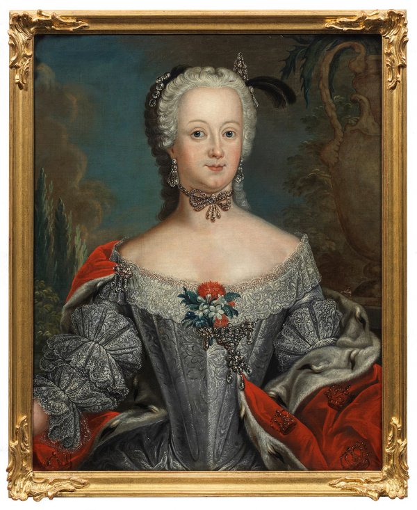 Um 1740 repräsentatives, historisch bedeutendes Bildnis der Kronprinzessin bzw. Königin (1715 - 1797) mit prunkvollem, opulentem Schmuck in einem reich mit Spitze verzierten Kleid, um die Schultern ein umgelegter, leuchtendroter, mit preußischen Königskronen dekorierter Hermelinmantel. An der Brust trägt sie vor dem Dekolleté ein kleines Bukett aus weißem Jasmin und roten Nelken. Im Hintergrund eine Parklandschaft. Mit dem in fein lasierender Malweise ausgeführten, künstlerisch herausragenden Porträt lassen sich eine Reihe von Bildnissen Pesnes bzw. aus dessen Werkstatt sowie Repliken der Zeit vergleichen, welche die Dargestellte in ganz ähnlicher Weise schildern. Hierzu gehören u. a. Gemälde im Neuen Palais in Potsdam, in der Burg Hohenzollern in Hechingen und im Stadtmuseum Bad Gandersheim. Ein immer wiederkehrendes Motiv in ihren Bildnissen sind rote Nelken. Öl/Lwd.; Rest., minim. Läsuren in der Lwd.; 80 x 65,5 cm. Rahmen.