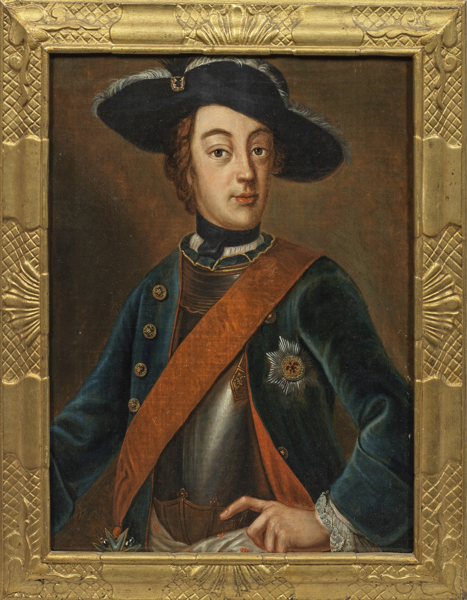 Repräsentatives Bildnis in Kürass und dunkelblauer Jacke, um die linke Schulter gelegt die orangerote Schärpe des ihm 1751 von König Friedrich II. von Preußen verliehenen Schwarzen Adlerordens, auf der Brust der korrespondierende Stern. Das Gemälde dürfte anlässlich der Ordensverleihung oder kurz danach entstanden sein, was auch dem Lebensalter des Dargestellten entspricht. Wilhelm Friedrich Ernst zu Schaumburg-Lippe (1724 - 1777) folgte seinem Vater 1748 in der Herrschaft. Am preußischen Hof Friedrich II. gehörte er zum Kreis um Voltaire. Im Siebenjährigen Krieg wurde er 1759 einer der bedeutendsten Heerführer, 1761/62 auch in Portugal gegen die Invasionsversuche Spaniens und Frankreichs. Öl/Lwd.; Verso alte Angaben zum Dargestellten "Wilhelm Fr. E. regierender Graf zu Schaumburg Lippe Bückeburg, Bburg N3. Königl. Portugiesischer General Feldmarschall. geb 1731 [sic!]. succeed. 1748. + 10 Sept 1777. Urgrossonkel des Prinzen Gustav zu Ysenburg u B". 43,5 cm x 32,5 cm. Rahmen.