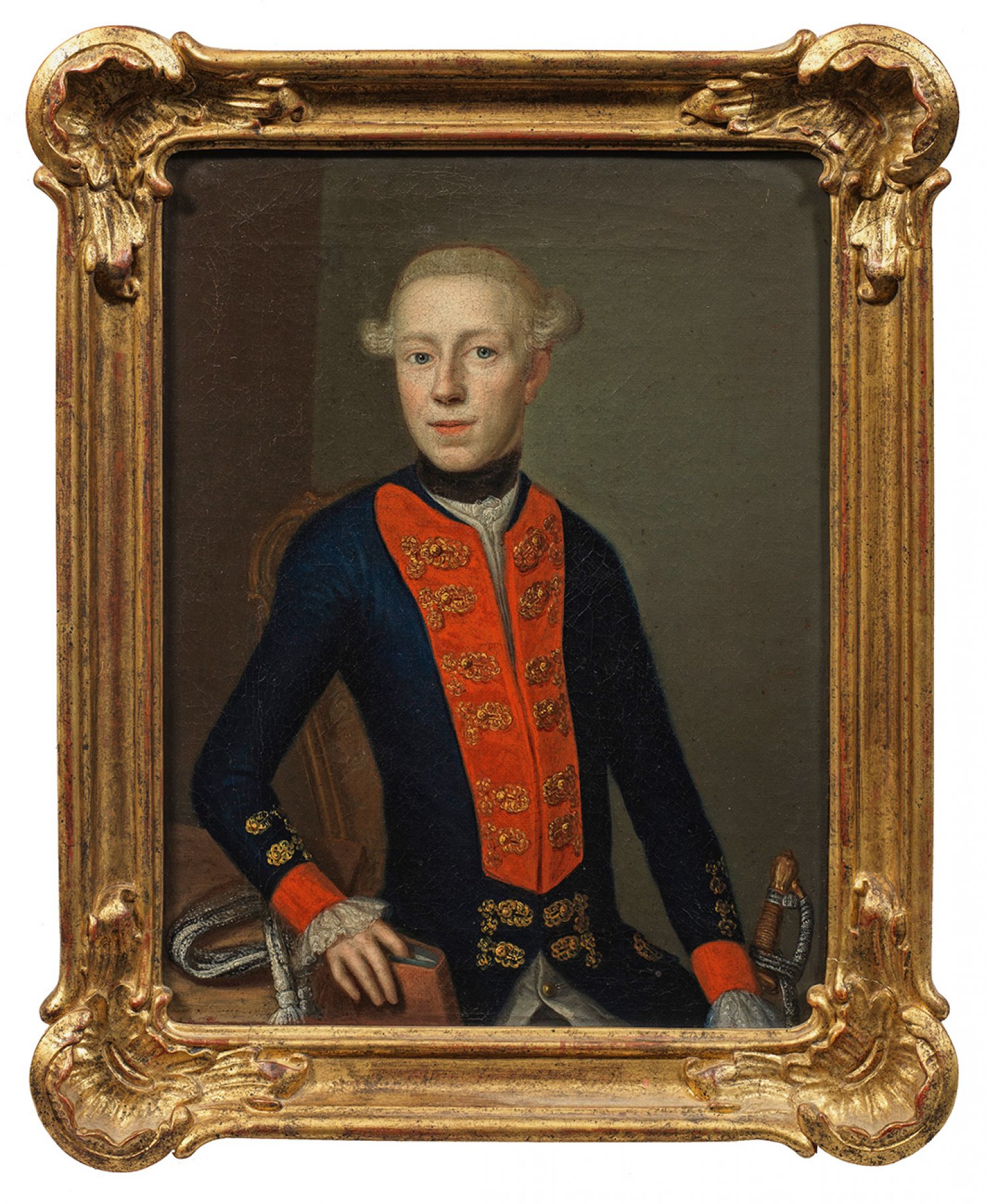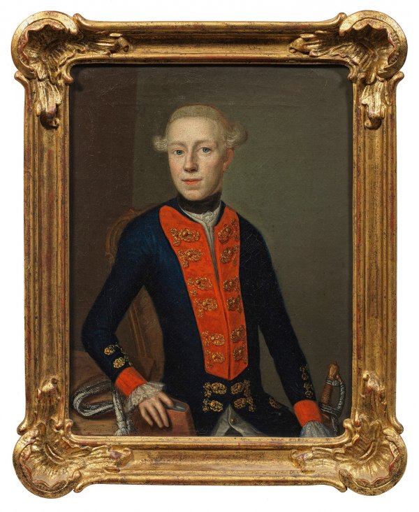 Repräsentatives, um 1770-1786 entstandenes Bildnis des an einem Tisch sitzenden Adeligen in dunkelblau-roter Uniform des Infanterie-Regiments Nr. 25 (1760-1782 von Ramin, 1782-1806 von Möllendorff) mit größtenteils zugeknöpftem Waffenrock und schwarzer Halsbinde als modisches Attribut. Zu seiner linken Seite ein Degen, die zugehörige Schärpe lässig auf dem Tisch liegend, in der rechten Hand ein Buch. Dies ist sehr wahrscheinlich ein Ausdruck dafür, dass sich hier ein junger, gebildeter Freiherr der friderizianischen Zeit zu Beginn seiner miltärischen Laufbahn und Offiziersausbildung in privatem Auftrag porträtieren ließ. Öl/Lwd.; 33 cm x 25,5 cm. Original-Rahmen.