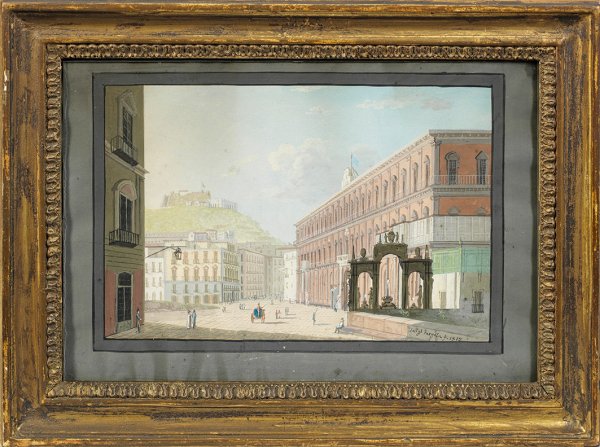 Im Hintergrund das Castel Sant’Elmo auf dem Stadthügel Volmero. Minutiös fein gemalte, atmosphärisch gestimmte. durch Figurenstaffage belebte Darstellung Fergulas, der durch seine meisterhaften Neapel-Veduten bekannt wurde. 1806 gab er ein später zweifach wiederaufgelegtes Buch mit gestochenen und radierten Ansichten der Stadt heraus. Gouache7Papier. R. u. sign. u. dat. 1810 (oder 1813). Blatt ca. 17 cm x 25 cm. Wohl Original-Rahmen.
