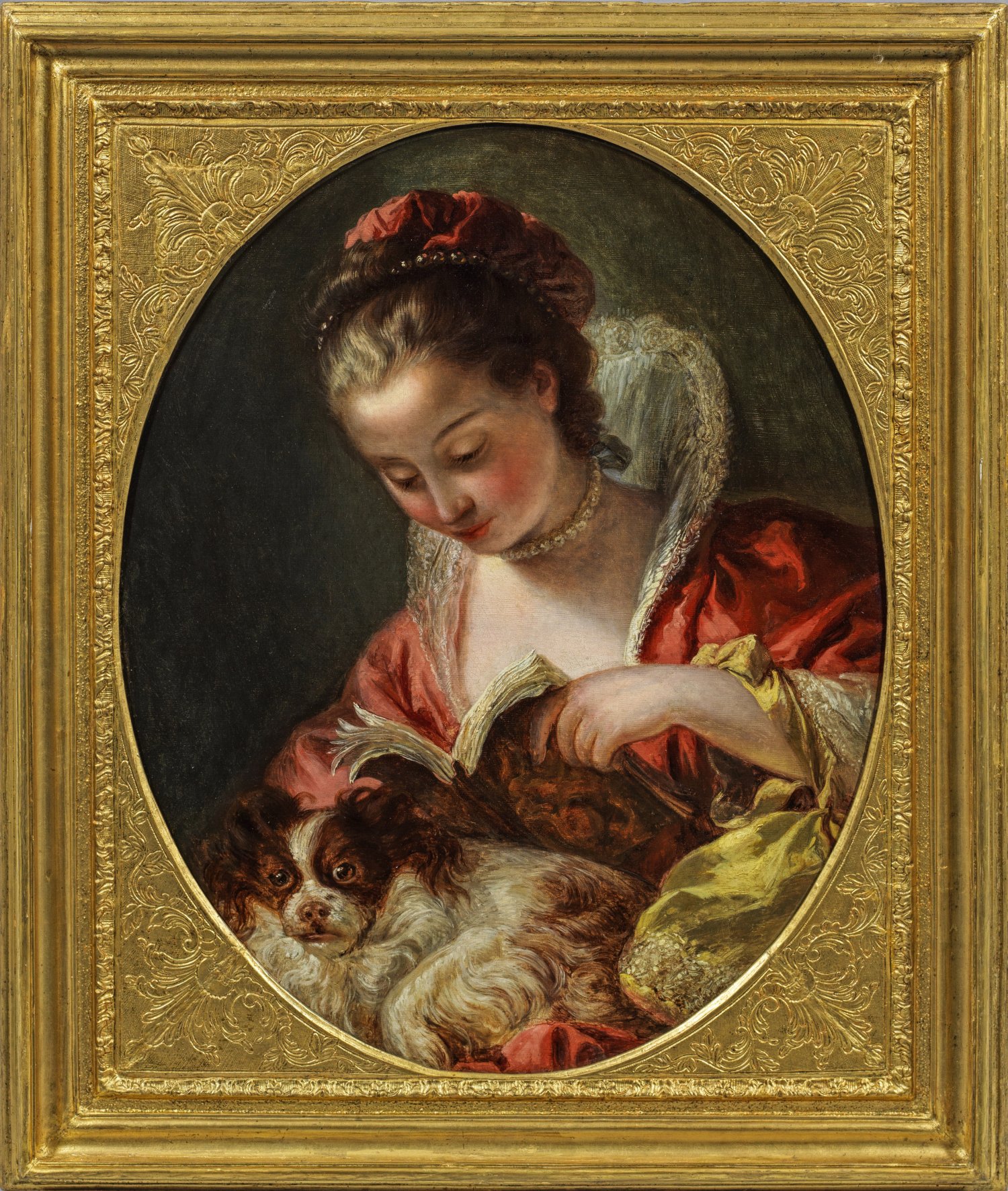 Das künstlerisch virtuos in ein Oval komponierte Gemälde zeigt das Bildnis einer jungen, reich gewandeten Frau mit Perlenschmuck, welche ganz in das Lesen eines Buches vertieft ist. Dieses ruht auf dem Rücken eines kleinen Hundes in ihrem Schoß, welcher dem Betrachter seine Beachtung schenkt. Den Reiz des Gemäldes steigerte der Maler durch eine weiche Lichtführung und einen pastelltonigen Farbenschmelz. Doyen lernte bei Carle (Charles-André) van Loo und erhielt den Grand Prix de Rome, der ihm einen Rom-Aufenthalt (1748-1755) mit Reisen nach Neapel, Venedig und Bologna ermöglichte. 1755 kehrte er nach Paris zurück, wurde 1777 Hofmaler des Grafen von Artois und Lehrer an der Académie royale de peinture et de sculpture in Paris. 1761 stellte Doyen "La lecture" im Salon in Paris aus. Bei Ausbruch der Französischen Revolution nahm Doyen eine Einladung Katharina II. von Russland an und reiste nach Sankt Petersburg, wo er 1791 Direktor der Akademie wurde. Öl/Lwd.; 73 cm x 60 cm. Rahmen.