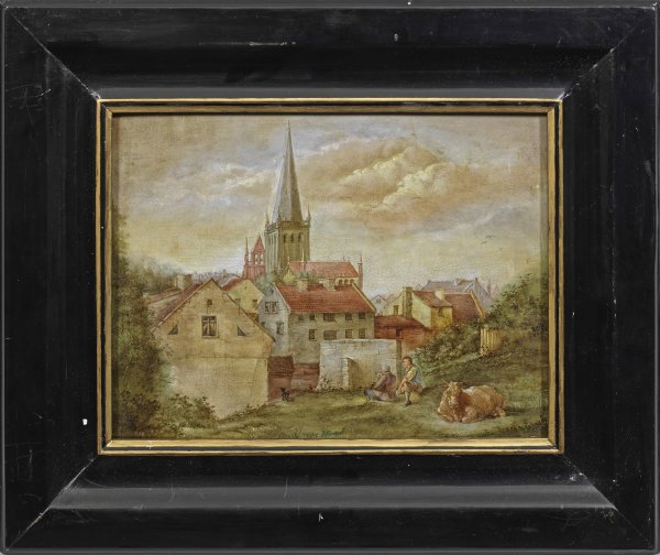 Blick vom Wall auf die Stadt mit dem Turm der Reformierten Kirche und dem vis-à-vis stehenden Giebel der Jakobuskirche in Memel (Klaipeda) vom Wall aus, im Vordergrund belebt durch eine Staffage aus zwei rastenden Männern mit Kuh und Hund. In fein lasierender Malerei ausgeführte, von der niederländischen Kunst des Barock beeinflusste, seltene Vedute von historischer Bedeutung: Memel bzw. Klaipeda war bis Mitte des 19. Jhs. eine kleine Stadt, so dass es nur wenige Ansichten von ihr gibt. Zum Kriegsende 1944/45 wurde Memel überdies stark zerstört und die einmarschierende Sowjetarmee riss die beiden dargestellten Kirchen Anfang 1945 ganz nieder. Öl/Holztafel. M. u. betitelt. 23,5 cm x 31 cm. Rahmen.