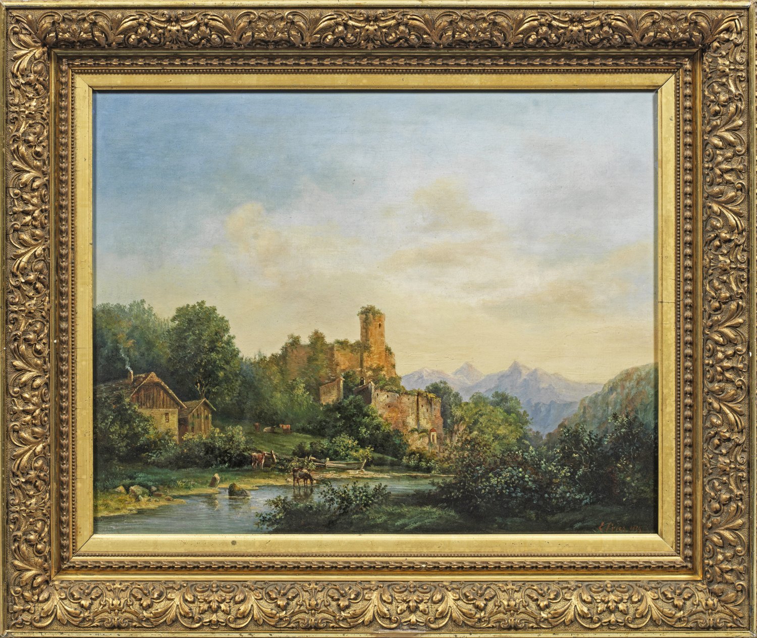 Oberitalienische Landschaft mit Burgruine und Gehöft am Fluss