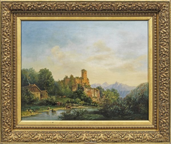 Romantische, koloristisch virtuose, atmosphärisch gestimmte Landschaft des Malers, dessen poetische Italien-Bilder zum Besten in der deutschen Kunst des frühen 19. Jhs. gehören; Mit Carl Rottmann und Karl Philipp Fohr war Fries zugleich einer der bedeutendsten Künstler der Heidelberger Romantik. 1823-1827 lebte Fries in Rom, von wo aus er weite Reisen durch Italien unternahm. Öl/Lwd., doubl.; R. u. sign. u. dat. 1824. 53,5 cm x 69 cm. Rahmen.
