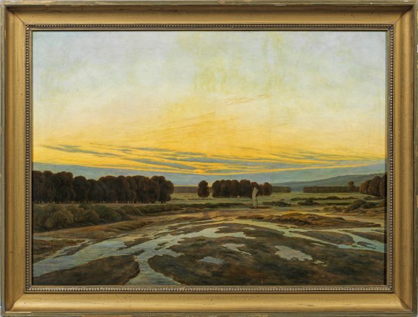 Blick auf das große Ostra-Gehege mit Elblandschaft bei Niedrigwasser. Künstlerisch qualitätvolle Kopie von Hans Schirmer (1882 Harburg - 1965 Dresden) nach dem (vor?) 1832 entstandenen Gemälde von C. Friedrich, das sich seit 1909 in der Galerie Neue Meister der Staatl. Kunstsammlungen in Dresden (Inv.-Nr. Gal.-Nr. 2197 A ) befindet und als "Krönung von Friedrichs Spätwerk" gilt. Öl/Lwd.; Verso von Hans Schirmer sign. u. bez.; 74 cm x 104 cm. Rahmen.