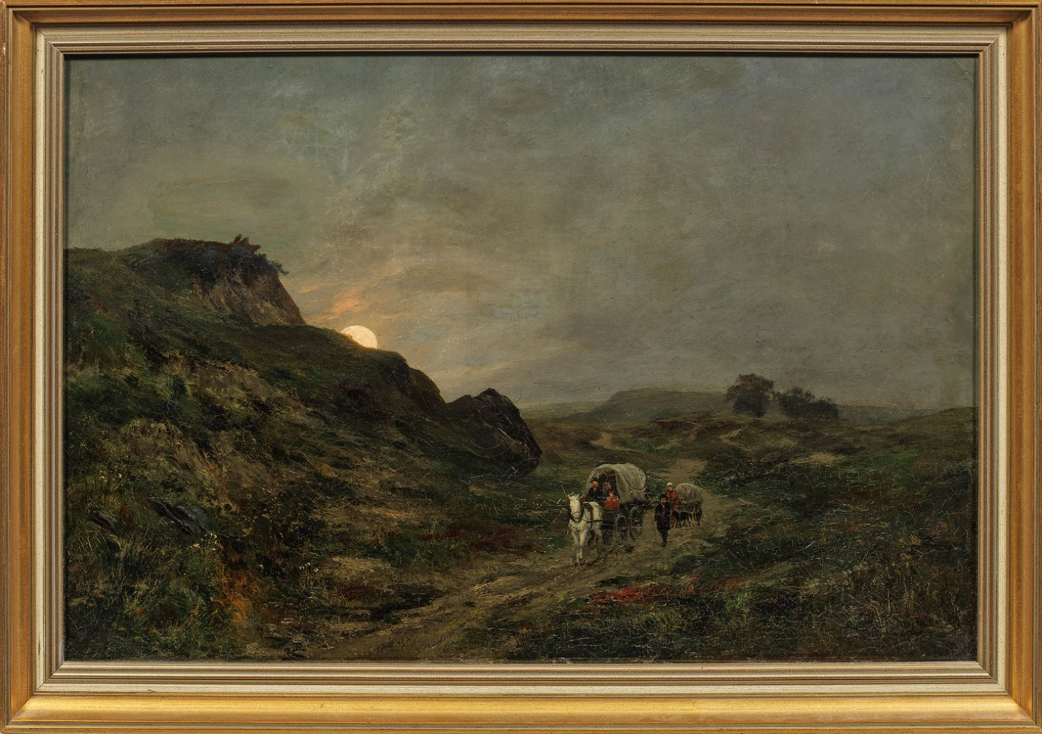In einsamer Felslandschaft eine Familie mit zwei Karren einen Weg entlangziehend, der von dem eben aufgehenden Mond mit schwachem Lichtschimmer überzogen wird. Mondscheinlandschaften waren im 19. Jh. sehr populär, erforderten aber ein Spezialistentum. Im Umfeld der Düsseldorfer Malerschule, der Böhmer angehörte, besaß die Nachtmalerei, ausgehend von Andreas Achenbach, eine ausgeprägte Tradition. Öl/Lwd.; R. u. sign. und bez.: Df.; Verso originales Ausstellungsetikett. 51 cm x 76 cm. Rahmen.