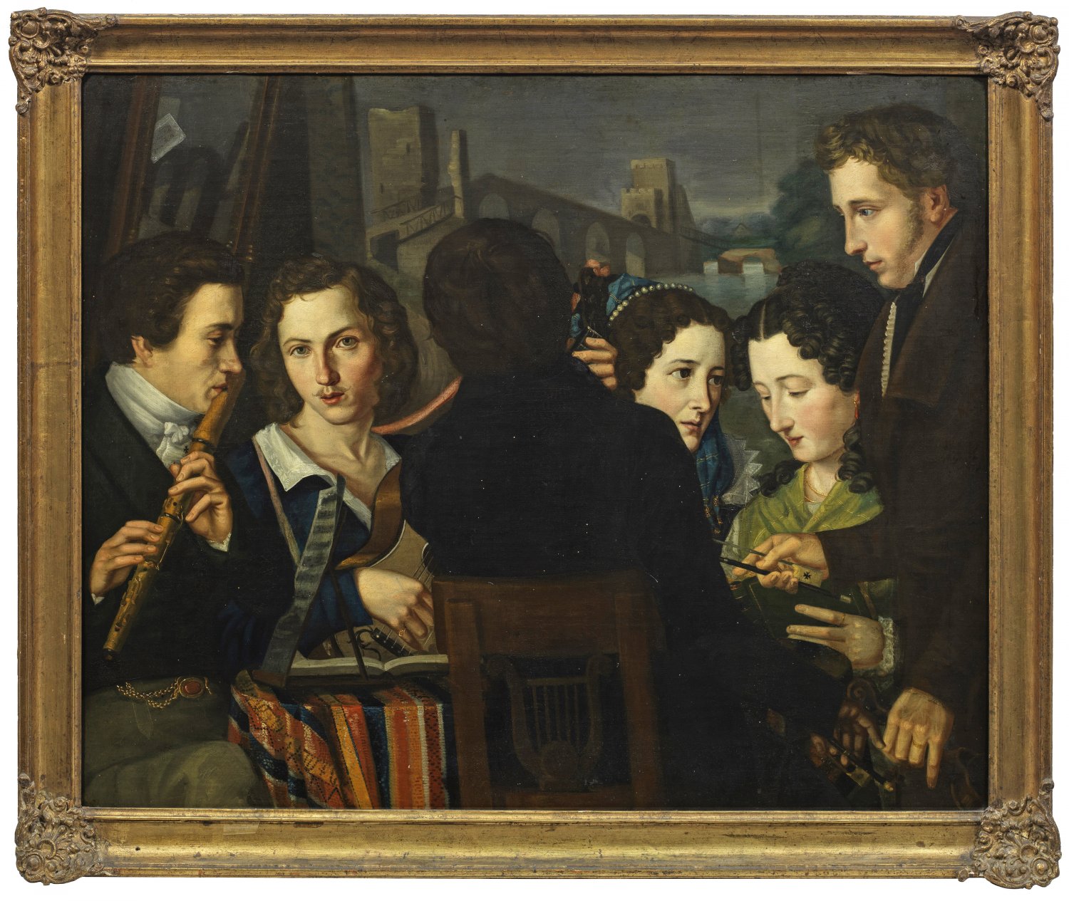 Szenische Darstellung mit einer dominant vor der Brücke platzierten Gruppe von jungen Männern und Damen. Ein kompositorischer Kunstgriff ist, dass die zentrale männliche Figur nur in Rückenansicht geschildert wird, wodurch die flankierenden Personen umso effektvoller porträtiert werden, verstärkt durch die Lichtführung. Ein für den damaligen und heutigen Betrachter faszinierendes Gemälde. Bei den Dargestellten handelt es sich ganz offensichtlich um sog. "Deutschrömer", die in Rom eine große Künstlerkolonie bildeten. Ankunftspunkt im Norden war die sog. "Ponte Molle" über den Tiber, wo die Neuankömmlinge der Künstlerschaft feierlich empfangen wurden. 1813/14 wurde die sog. "Ponte-Molle-Gesellschaft" gegründet, welche spaßeshalber die Gepflogenheiten eines Ritterordens annahm. Dies erklärt die schwarzen Tatzenkreuze bei den Herren auf diesem Gemälde. Öl/Lwd., doubl.; M. u. auf der Stuhlrückenlehne undeutl. monogr. ("CW?") u. dat. ("1825?"). 79 cm x 99 cm. Rahmen.