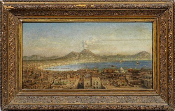 Von einem erhöhten Standpunkt aus schildert der Maler in panoramaartiger Weise die Stadt mit der Bucht und dem Vesuv im warmen Abendlicht. Hauschild, der ausgebildeter Architekt war, bildete sich in Italien zum Architekturmaler weiter, wurde Professor an der Dresdener Akademie und deren Mitglied. 1851 ging Hauschild ganz nach Italien, wo er in Rom, später in Neapel und dem nahegelegenen Sorrent lebte. Ab 1834 beteiligte sich Hauschild mit seinen stimmungsvollen Architekurbildern an zahlreichen Ausstellungen, insbesondere in Dresden, aber auch in Berlin, Köln und Wien. Öl/Lwd., doubl.; 31 cm x 60,5 cm. Rahmen.