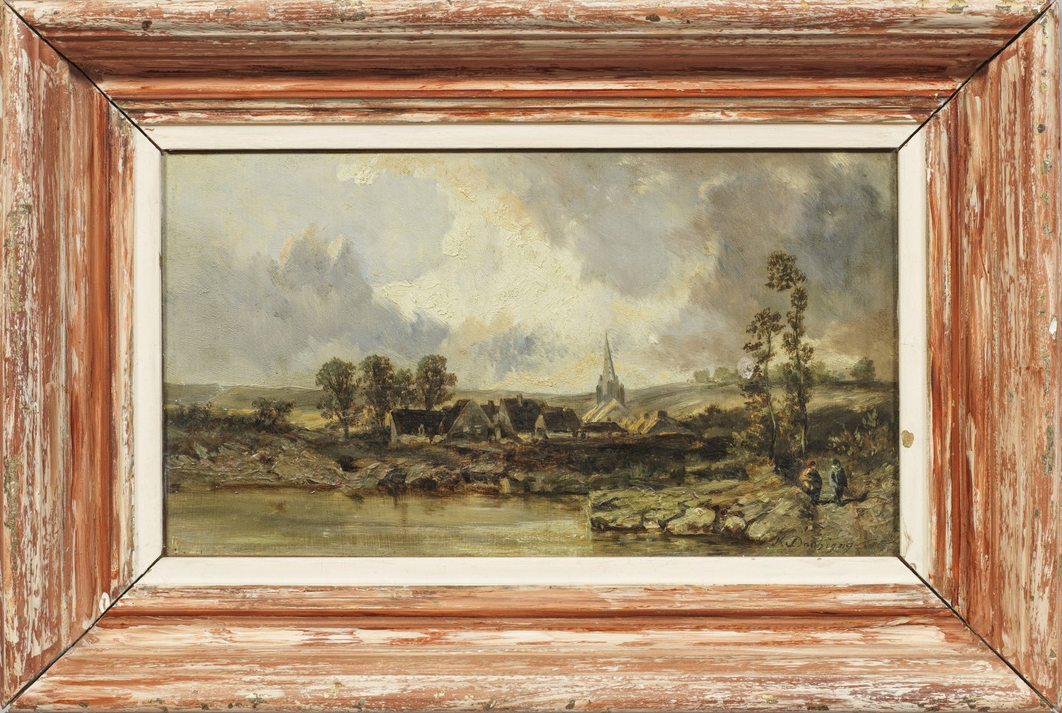 Impressiv aufgefasste Landschaft des Künstlers, der zur Schule von Barbizon gehörte. Ausgebildet von seinem Vater Charles François Daubigny und überdies beeinflusst von Eugène Boudin und Johan Jongkind, debütierte er bereits 1863 im Salon und gewann dort 1868 und 1874 Medaillen. Seine Motive fand er hauptsächlich in Auvers, der Normandie und Fontainebleau. Mit seinen Werken ist Daubigny in einer Reihe französischer Museen vertreten, u. a. im Musée d'Orsay in Paris. Öl/Malkarton. Sign.; 17,5 cm x 31 cm. Rahmen.