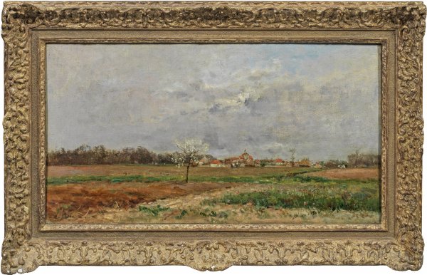Impressiv aufgefasste Landschaft Damoyes, der zur Schule von Barbizon gehörte. Damoye studierte an der École des Beaux-Arts bei Léon Bonnat, widmete sich aber früh der Landschaftsmalerei. Hierbei wurde er von Jean-Baptiste-Camille Corot und Charles-François Daubigny beeinflusst, deren helle Farbpalette und lockeren, impressionistischen Duktus er übernahm. Damoye ist auch einer der bedeutendsten Künstler der "Schule von Pontoise", er malte an den Ufern der Seine und der Oise, in der Picardie und Normandie sowie im gesamten großen Loire-Tal. 1875 debütierte er auf dem Salon, 1889 erhielt er eine Goldmedaille bei der Weltausstellung. Obgleich er Mitbegründer der abtrünnigen, konkurrierenden Société Nationale des Beaux-Arts (1890) war, gehörte er ab 1900 auch der Salon-Jury an. Öl/Holztafel. L. u. sign.; 32 cm x 60 cm. Rahmen.