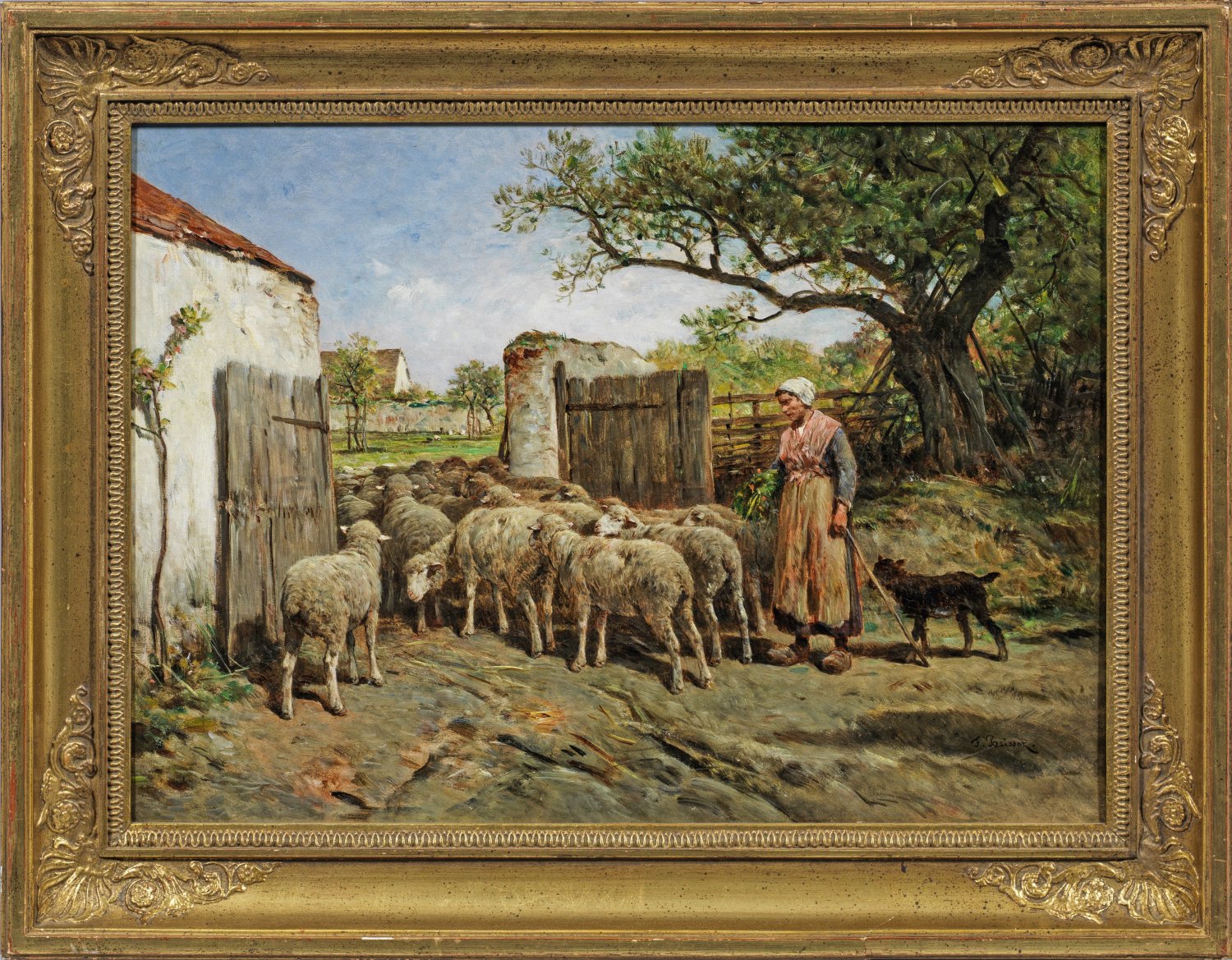Motiv- und stiltypisches Werk des an der École des Beaux-Arts und von Léon Coignet ausgebildeten Tier- und Landschaftsmalers, der ab 1840 im Pariser Salon ausstellte. Beeinflusst von der Schule von Barbizon malte er u. a. in der Umgebung von Compiègne und Fontainebleau. Mit Vorliebe stellte er Schäfer und Hirtinnen sowie Schafherden dar, die er in atmosphärisch gestimmte, impressiv aufgefasste Landschaften komponierte. Außer in einer Reihe französischer Museen befinden sich auch im Boston Museum of Fine Arts und im Brooklyn Museum Werke mit vergleichbaren Motiven. Öl/Lwd., doubl.; R. u. sign.; 40 cm x 55 cm. Rahmen.