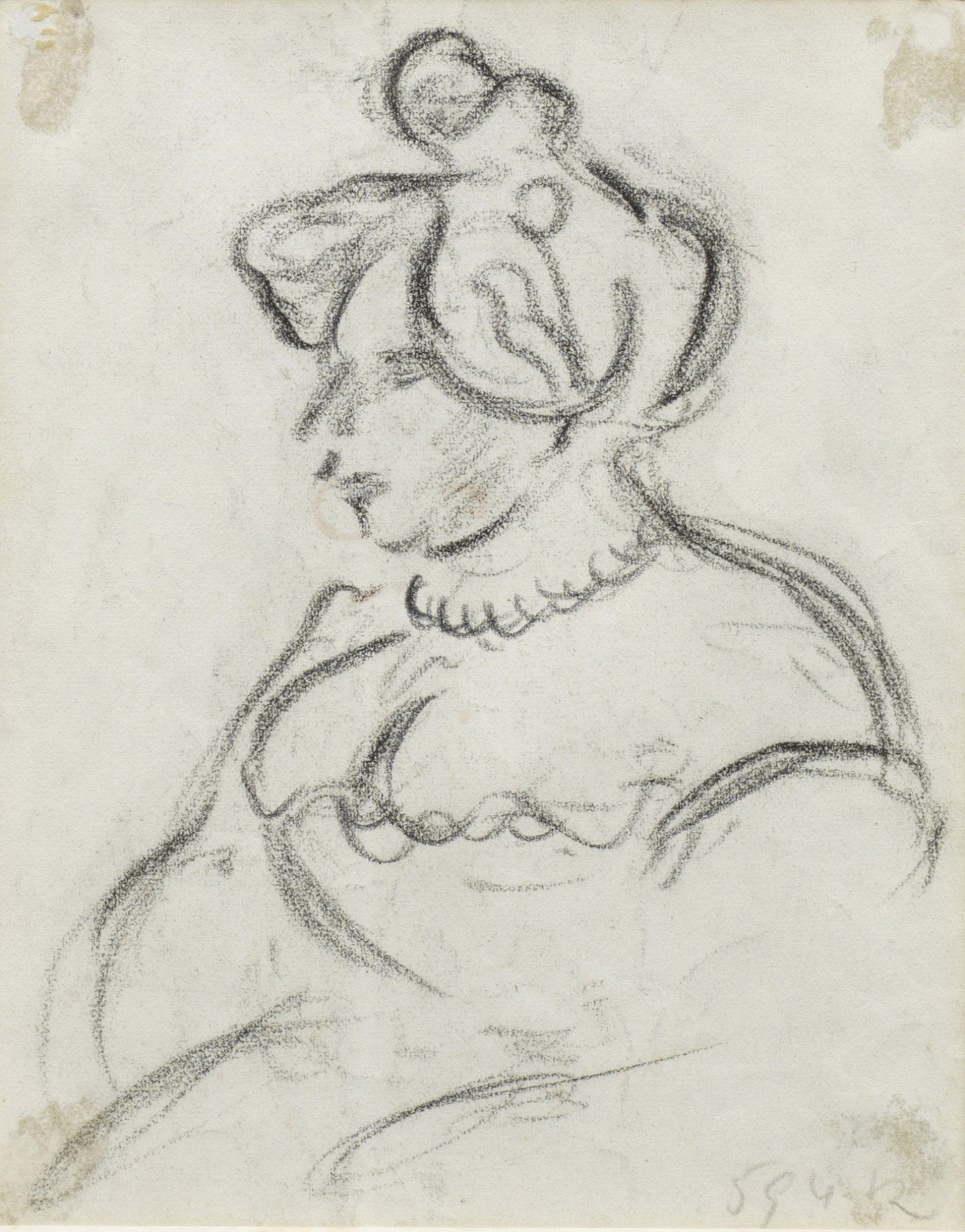 Zille zeichnete neben heiteren Szenen auch das abseitige Großstadtleben der Straßen, Hinterhöfe, Amüsierlokale, Kabaretts und Bordelle. Exemplarisch hierfür steht dieses Blatt, bei der Zille die Opulenz des Körpers, des Dekolletés und der Hochsteckfrisur bei der Dargestellten faszinierte. Kohle bzw. schwarze Kreide/Papier. Verso Nachlass-Stempel in Rot. In den Ecken Montierungsspuren. Blatt ca. 15,5 cm x 12,5 cm. Rahmen.