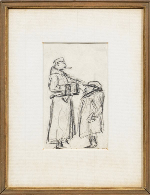 Ganzfigurige, karikaturenartige Darstellung eines großgewachsenen Mannes in langem Mantel, ihm gegenüberstehend ein deutlich kleinerer, ihm bis zur Taille reichender, untersetzter Mann mit breitkrempigem Hut. Schwarze Kreide/Briefumschlagrücks. (von der "Redaktion der Lustigen Blätter" adressiert an "Herrn H. Zille (/) Charlottenburg (/) Sophie Charlottenstr. 88"). Ca. 16 cm x 10 cm (Passepartoutausschnitt). Rahmen.