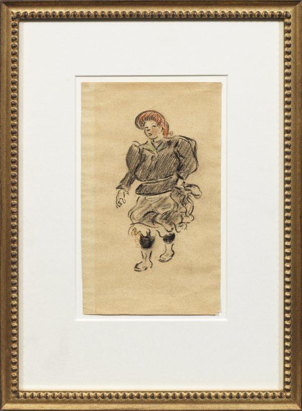 Ganzfigurige Darstellung einer in lässiger, selbstbewusster Pose auf einer Straße gehenden Berlinerin, deren Charakter Zille in virtuoser Weise auch in ihrer kraftvollen Statur zum Ausdruck bringt. Schwarze u. farbige Kreide/Papier. Verblasster Nachlass-Stempel in Rot. Gebräunt. Blatt 22,5 cm x 13,7 cm. Rahmen.