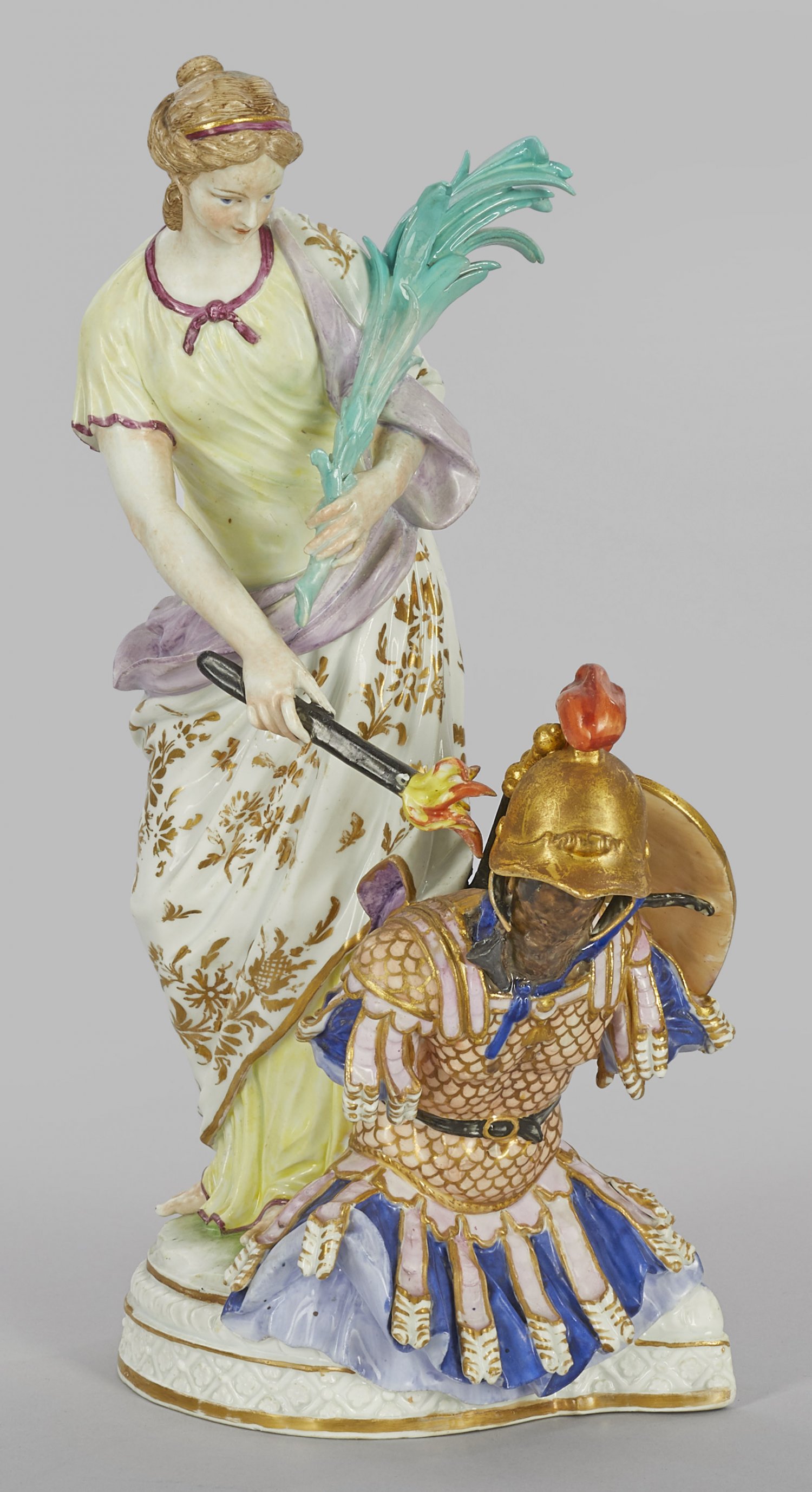 "Eirene". Originaltitel Geschweifter, mehrfach gegliederter Sockel, umzogen von verschiedenen reliefierten Ornamentbordüren. Im Kontrapost stehende griechische Friedensgöttin Eirene in zartgelbem Gewand und weißem, von Goldblüten gemustertem Mantel, blickend auf die zu ihren Füßen liegende Kriegstrophäe in Form eines Baumstammes mit römischem Harnisch, federbekröntem Helm, Schwert und Schild. In der linken Hand ihr Attribut, einen Palmwedel als Symbol des Friedens haltend. Mit der Rechten eine brennende Fackel in Richtung des Harnisch richtend. Polychrome Malerei mit Goldstaffage. Entw. Michel Victor Acier, um 1774. Unw. rest.; Schwertermarke. H. 29,5 cm.