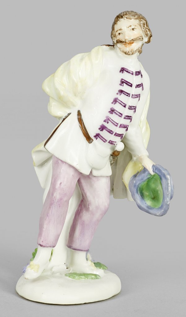 "Scapin" aus der Italienischen Komödie ursprünglich für Johann Adolph II., Herzog von Sachsen-Weißenfels gefertigt. Auf einem mit Blüten und Blättern belegten Sockel stehender Komödiant in purpurfarbener Hose, weißer Jacke mit hellgelbem Umhang, in der linken Hand eine blaue Kappe haltend. Polychrome Malerei. Entw. Peter Reinicke. Unw. rest.; H. 13,5 cm.