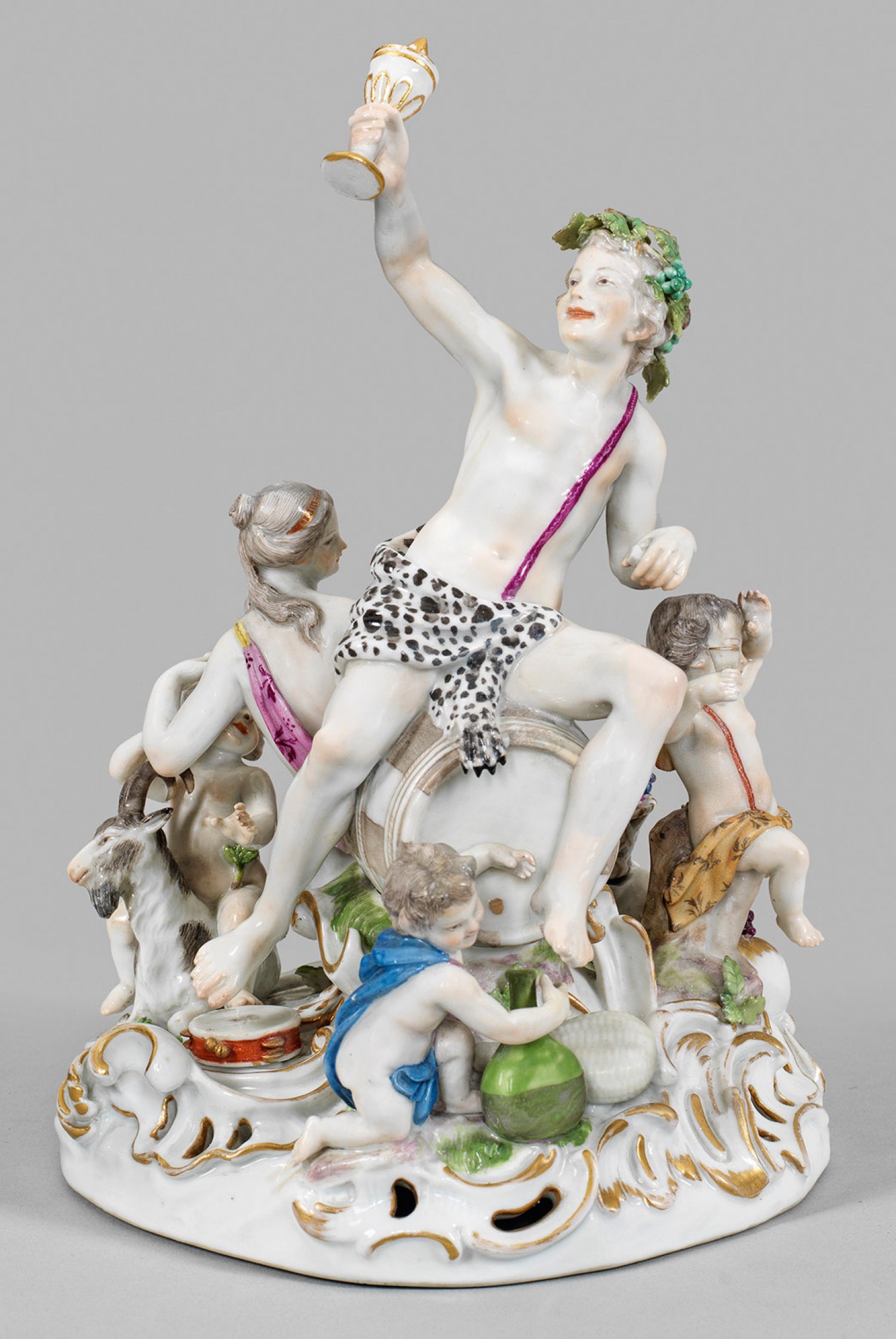 Bacchantengruppe Von stark plastischen Rocaillen gerahmter Sockel. Auf großem Weinfass sitzender, von Weinreben bekränzter Bacchus in Begleitung eines Puttos, in der erhobenen rechten Hand einen Weinpokal haltend. Rückseitig junge Bacchantin mit Früchtekorb. Zu ihrer Seite eine auf einem Ziegenbock sitzende Amorette bzw. ein tanzender Knabe mit Weinglas. Polychrome Malerei mit Goldstaffage. Entw. Johann Joachim Kaendler und Friedrich Elias Meyer. Unw. rest.; Schwertermarke. H. 23 cm.