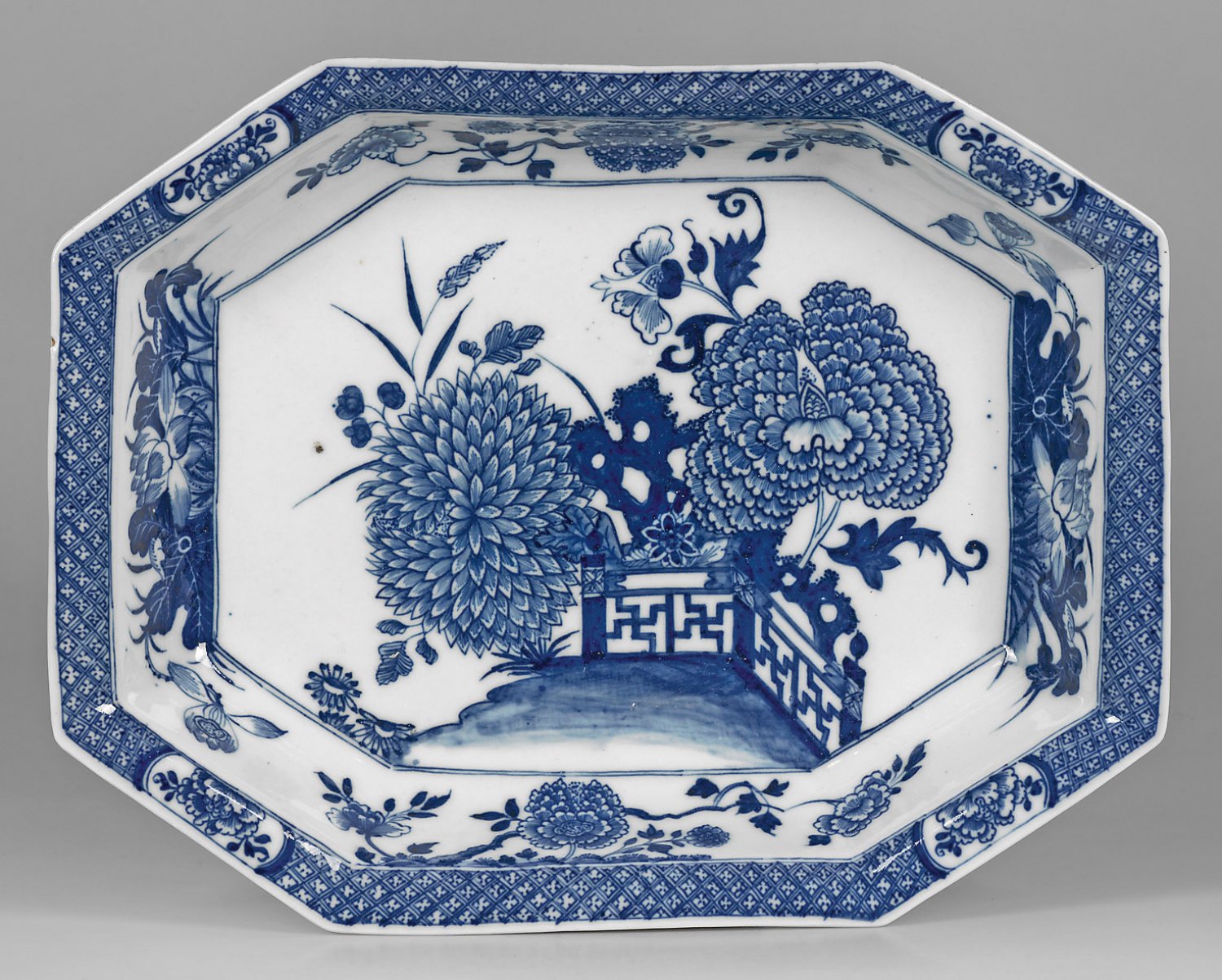 Große Anbietschale mit Blaumalerei Achteckige Form mit steiler Wandung und schmaler, ansteigender Fahne. Im vertieften Spiegel umzäunter chinesischer Garten mit zwei großblumigen Chrysanthemenstauden. Auf der Innenwandung analoge Blumenarrangements. Gitterwerk-Fries. Unterglasurblaue Malerei. Maler-Sign. "K", wohl Johann David Kretzschmar oder Peter Kolmberger. Rand minim. best.; Schwertermarke. H. 5,5 cm. 32,5 cm x 25 cm.