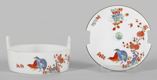 Seltene Butterdose mit Wachteldekor Runder, zylinderförmiger Korpus, beidseitig zwei hochstehende, gelochte Griffe. Leicht gehöhter Deckel, mittig plastischer, in Seegrün staffierter Pinienknauf. Auf der Wandung und dem Deckel ein Wachtelpaar unweit eines blühenden Prunusbaumes und Kikyô-Pflanze (Ballonblume). Polychrome, teilw. goldgehöhte Malerei im Kakiemonstil. Dunkelbrauner Rand. Schwertermarke. H. 6 cm. D. 10 cm.