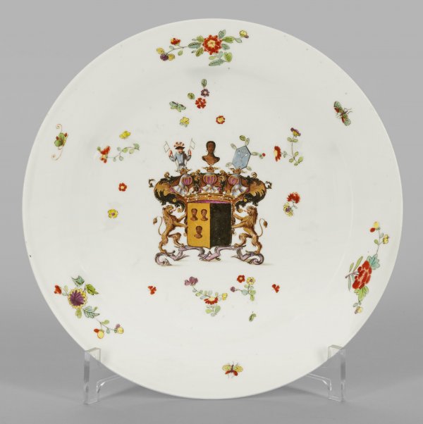 Teller aus dem Service des Grafen von Seydewitz Runde Form mit glattem Rand. Im leicht vertieften Spiegel farbiges Wappen des Reichsgrafen August Friedrich von Seydewitz, umgeben von gestreuten Indianischen Blumen, Blumenzweigen und Insekten im Kakiemonstil. Polychrome Malerei mit Goldstaffage. Rand minim. rest.; Schwertermarke. D. 22 cm.