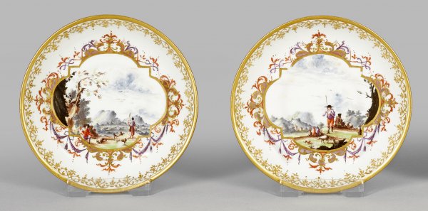 Paar Unterschalen mit Gelbfond und pastoralen Landschaften Runde, gemuldete Form. Im Spiegel goldgerahmte, von purpurfarbenem und eisenrotem Laub- und Bandelwerk umzogene Vierpassreserve mit Lüsterfond. Darin idyllische, ländliche Szene von Schäfern mit ihren Tieren vor imposanter, bergiger Landschaftskulisse. Umlaufende Goldspitzenbordüre. Außenwanden mit kräftigem, gelbem Fond. Dreherzeichen für Johann Martin Kittel (tätig seit 1727). Schwertermarke. D. 11,5 cm.