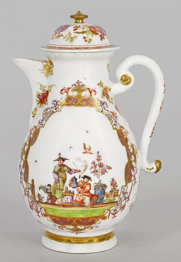 Kaffeekanne mit Hoeroldt-Chinoiserien Birnförmiger Korpus mit S-förmig geschwungenem Volutenhenkel und spitzem Schnabelausguss. Beidseitig der Wandung goldornamentierte Vierpassreserven mit Lüsterfond, umzogen von Laub- und Bandelwerk in Purpur, Eisenrot und mit wenig Gelb. Darin feine, szenische Darstellung von Chinesen in blühender, asiatischer Gartenlandschaft, sog. Chinoiserien. Schau- und rückseitig lebhafte Gruppe von Chinesen in kostbaren, festlichen Gewändern bei der Teezeremonie, begleitet von einem Kind mit Blumenschale bzw. rauchender Fackel. Umlaufend farbenprächtiger Indianischer Blumendekor aus emporwachsenden Päonien- und Chrysanthemenstauden in japanischem Kakiemonstil. Korrespondierende Gestaltung mit farbiger Blütenbordüre auf dem Deckel. Äußerst feine polychrome Malerei, wohl Werkstatt von Johann Gregorius Hoeroldt. Ber. Gold-Nr. 31 auf der Kanne. Unw. rest.; Schwertermarke. H. 21 cm.