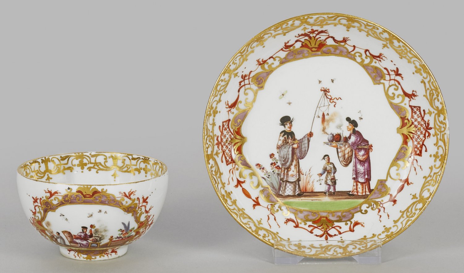 Koppchen mit Hoeroldt-Chinoiserien auf Unterschale. Auf der Wandung und im Spiegel goldoramentierte, von eisenrotem Laub- und Bandelwerk umzogene Reserven mit Lüsterfond. Darin szenische Darstellung von kostbar gekleideten Chinesen in blühenden Gartenlandschaften bei der Teezeremonie bzw. im Spiel mit Kindern. Im Spiegel der Tasse feines Kakiemonmotiv mit Indianischem Blütenzweig. Feine polychrome Malerei. Umlaufende Goldspitzenbordüre. Dreherzeichen für Gottfried Bergmann (seit 1732 tätig) oder Paul Wildenstein (seit 1719 tätig). Gold-Nr. 12 auf Koppchen und Unterschale. Schwertmarke. H. 4,5 cm.