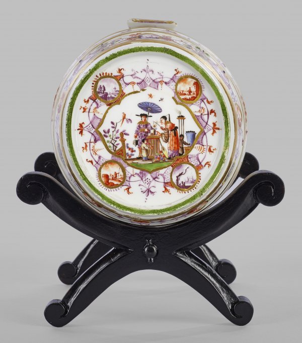 Tonnenförmiger, gebauchter, von profilierten Goldreifen gegliederter Korpus. Oberhalb Öffnung mit flachem, rechteckigem Deckel. Auf der Wandung umlaufende Dekorbänder aus Laub-, Bandel- und Gitterwerk und kleinen, goldgerahmten und in Eisenrot konturierten Medaillons und Reserven. Darin unterschiedliche Chinesen-, Kauffahrtei- und Landschaftsszenen, teilw. auf Lüsterfond. Schau- und rückseitig vierpassige, von purpurfarbenem und eisenrotem Rankenwerk sowie Medaillons umzogene Reserven mit Chinoiserien. Szenische Darstellung einer festlichen Gesellschaft bei der Teezeremonie in blühender Gartenlandschaft. Äußerst feine polychrome, purpurfarbene und eisenrote Camaieumalerei, teilw. in Gold gehöht. Reiche Goldstaffage. Erg. Messingausguss sowie schwarz lackiertes Holzgestell. Schwertermarke. H. 15,5 cm. D. 13 cm.