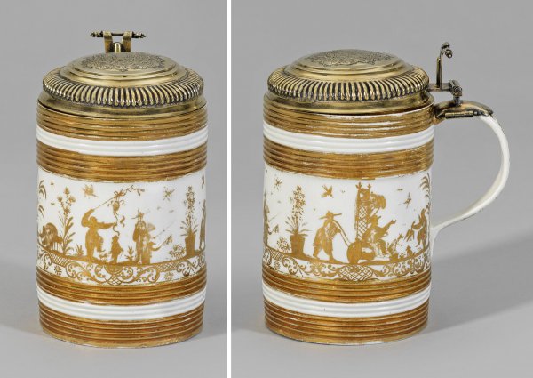 Außergewöhnlicher Humpen mit Goldchinesen Böttger-Porzellan. Walzenförmiger, ober- und unterhalb durch teilw. vergoldete Profilrillen gegliederter Korpus mit breitem, goldornamentiertem Bandhenkel. Auf der glatten Mittelwandung umlaufender Fries mit verschiedenen Chinesenszenen auf Ornamentkonsolen aus Laub- und Gitterwerk, sog. Chinoiserien. Vielfigurige Darstellungen von festlich gekleideten, durch blühende Gartenlandschaft wandelnden Chinesen, eines Mannes bei der Teezeremonie mit Diener, der den Wasserkessel anheizt bzw. einer hochgestellten, im zweirädrigen Baldachinwagen chauffierten Persönlichkeit. Äußerst feine, radierte Goldmalerei wohl von Abraham Seuter in Augsburg oder Werkstatt. Mehrfach gestufter, ornamentierter, innen vergoldeter Silberdeckel mit Daumenrast und einer von Laub- und Bandelwerk umzogenen Kartusche mit korrespondierender Chinoiserie. Im Boden Ausstellungsetikett des Kunsthauses Zürich von 1955, Nr. „Ny 41a“. H. 17 cm.