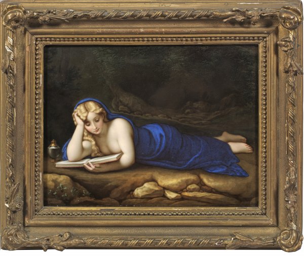 Porzellangemälde "Die büßende Maria Magdalena" Rechteckige Bildplatte mit der Darstellung der auf felsigem Boden vor dem Hintergrund einer nächtlichen Waldlandschaft liegenden Maria Magdalena, in einem Buch lesend. Nach einem Gemälde von Antonio da Correggio (1489-1534), italienischer Maler der Renaissance. Feine polychrome Malerei. Schwertermarke. Stuckierter und vergoldeter Rahmen Rosendekor und Kordelbandborüre, best.; Rahmen 29,5 cm x 35,5 cm.