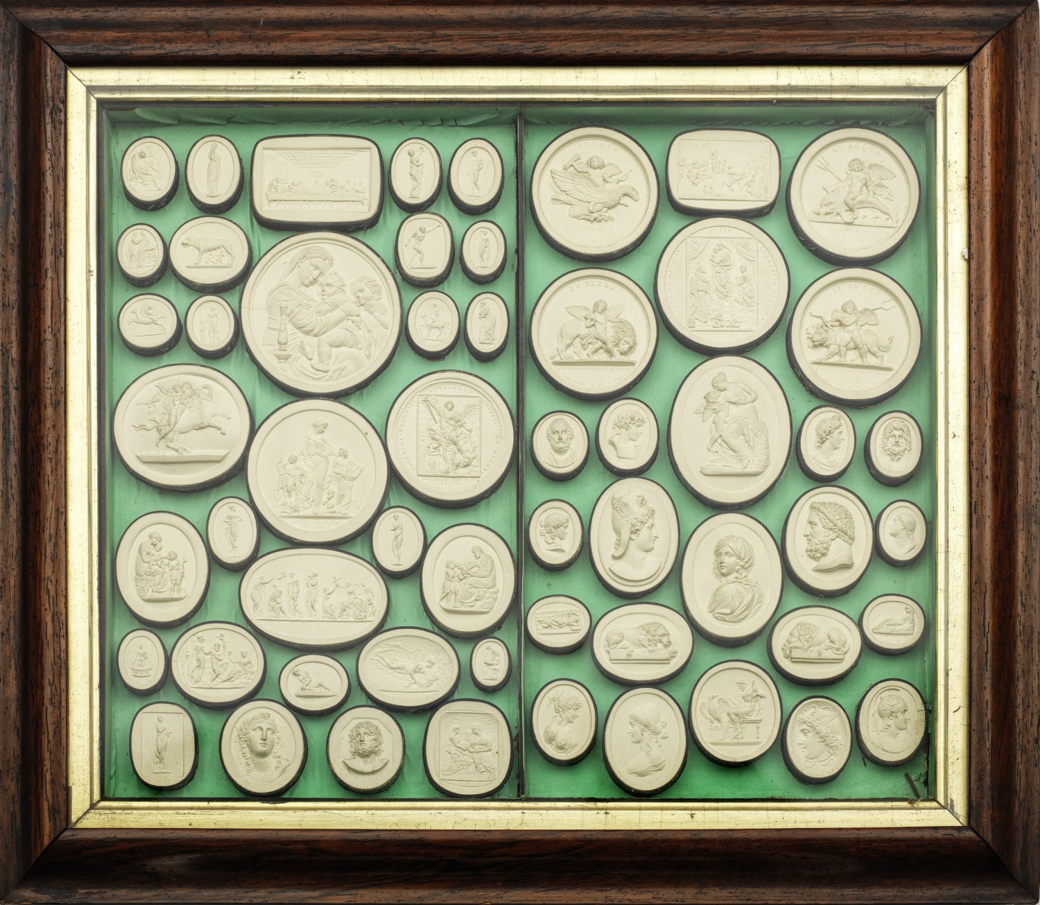 Daktyliothek Holz, Papier, Gips. Ein Schaukasten mit 56, über mintgrünem Papier eingefassten und montierten Gipsmedaillons mit Meisterwerken u. a. der Antike aus großen europäischen Sammlungen in Rom, Florenz oder Neapel. Darstellungen z. B. der Kapitolinischen Wölfin mit Romulus und Remus, des Abendmahls von Leonardo da Vinci oder der Madonna della Sedia von Raffaello Santi. Gipsmedaillons mit schwarzer Fassung und weißer Nummerierung. Teilw. best.; Rahmen besch. H. 4,5 cm. 49 cm x 42 cm.