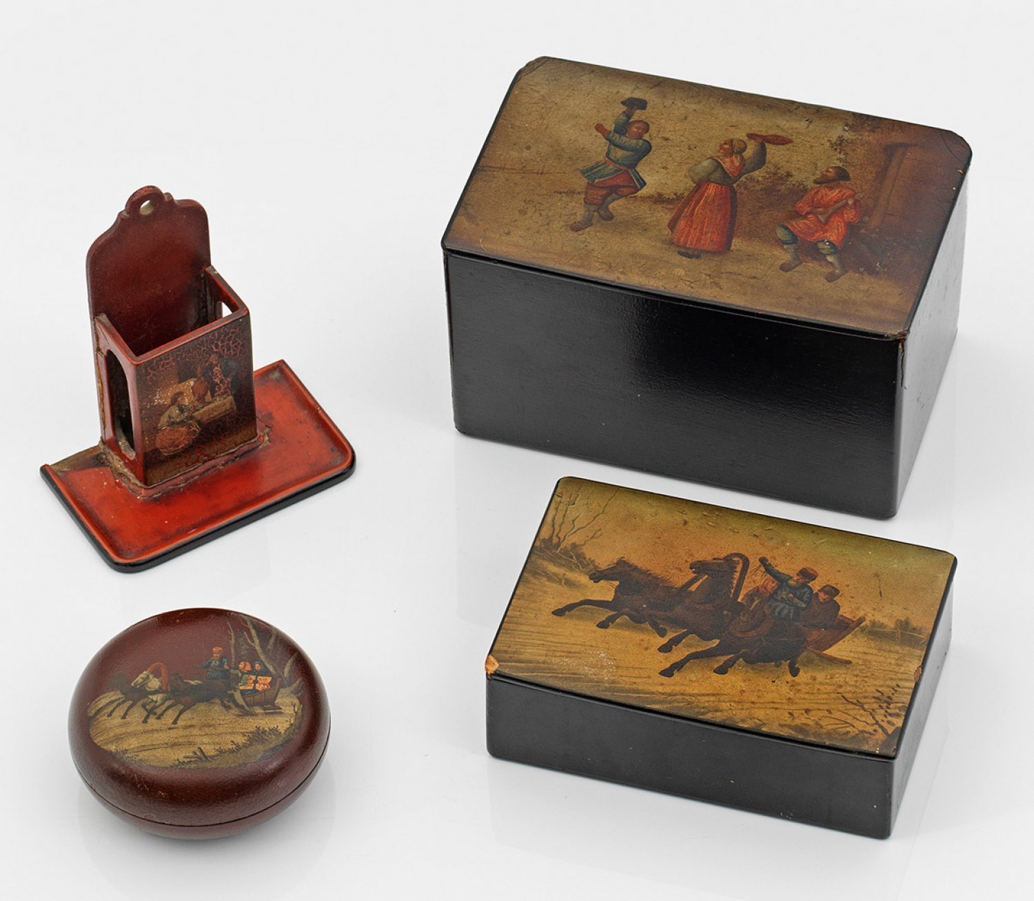 Konvolut russische Lackdosen Zwei Tabakdosen, eine Teedose sowie ein Streichholzschachtelhalter. Pappmaché, schwarz lackiert, innen teilw. zinnoberrot bzw. dunkelrot. Rechteckige und runde Form. U. a. Darstellungen von Trojkafahrten im Schnee bzw. tanzenden und musizierenden Bauersleuten. Polychrome Lackmalerei mit Gold. Herstellermarke. Teilw. besch.; H. 3,5 cm - 11,5 cm.