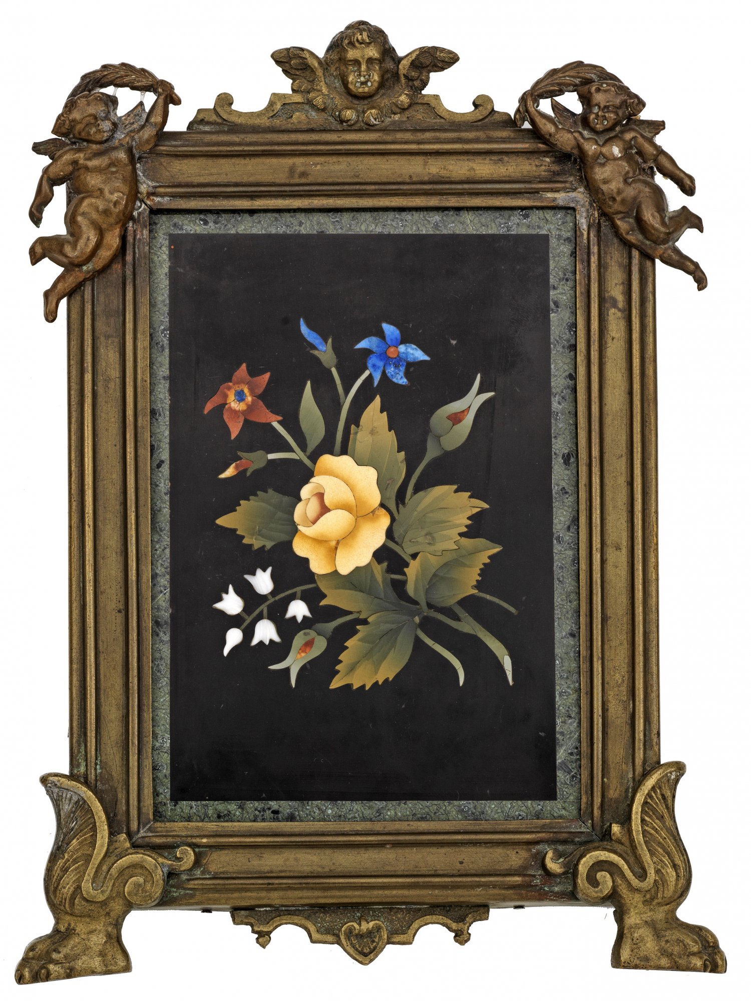 Kleine Pietra-Dura Bildplatte Schwarzer und grün-grauer Marmor, mit Intarsien aus unterschiedlichen Schmucksteinen, wie z. B. Achat und Lapislazuli. Naturalistische Darstellung eines Blumenstraußes aus Maiglöckchen und einer Rose sowie unterschiedlichen, kleinen Blüten. Prunkvoller Messingrahmen zum Aufstellen mit reliefplastisch gearbeiteten Putten und Löwenfüßen. Minim. altersgemäße Gebrauchsspuren. 17 cm x 13 cm.