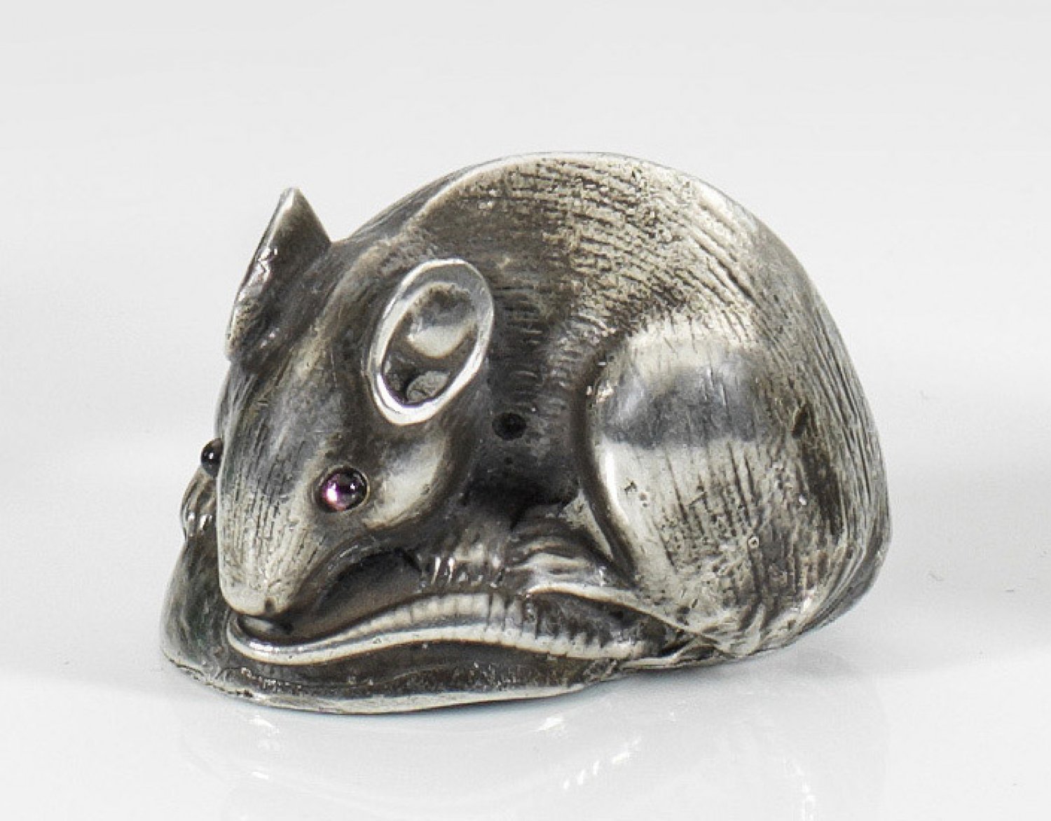 Miniatur-Maus im Stil von Karl Fabergé. Silber. Naturalistische, vollplastisch gearbeitete Darstellung einer zusammengekauerten Maus mit gravierter Fellzeichnung. Als Augen zwei kleine Rubincabochons. Gest. 84. Gew. ca. 43 g. H. 2 cm.