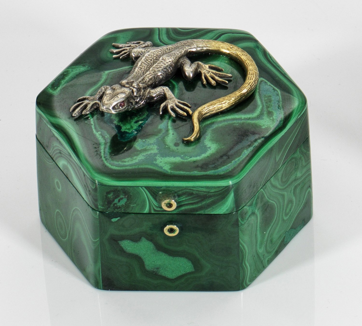 Malachitdose im Stil von Karl Fabergé. Hexagonale Form mit gerader Wandung. Auf flachem Deckel naturalistisch gearbeitete Eidechse aus teilvergoldetem Silber, besetzt mit zwei Granatcabochons als Augen. Minim. best.; Gest. 84. H. 6 cm. D. 6,7 cm.
