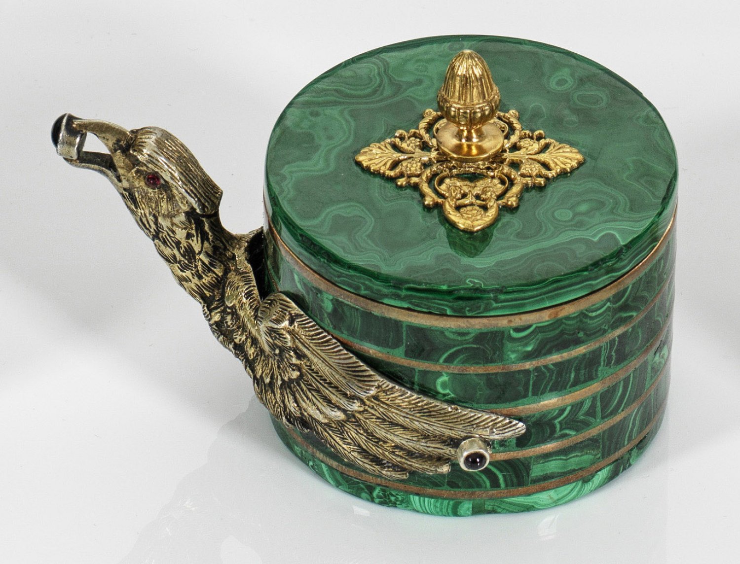 Außergewöhnliche Malachitdose im Stil von Karl Fabergé. Runde Form mit gerader, durch fünf umlaufend horizontal verlaufende Kupferringe gegliederte Wandung. Schauseitig ein bis zur Brust vollplastisch dargestellter Adler mit über die Wandung ausgebreiteten Flügeln, einen Cabochon im Schnabel haltend. Auf flachem Deckel ein Knauf in Form einer Eichel, umgeben von Ranken und Voluten. Das Wandungsinnere mit Kupfer ausgekleidet. Minim. best.; Gest. 84. H. 7 cm. D. 6 cm.